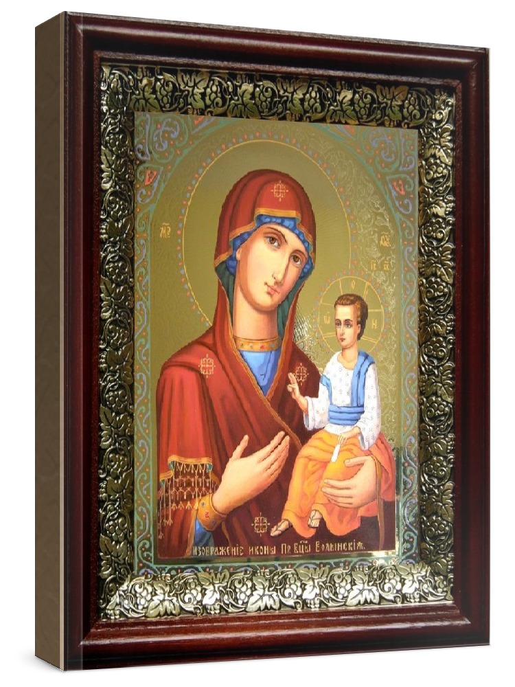 Волынская икона бм (19х22), темный киот. Лик нанесен методом шелкографии на цельную липовую доску, покрытую левкасом (специальным грунтом под живопись). Использованы минеральные (природные) краски. Размер иконы без киота (см): 13х16, с киотом: 19х22. Киот (рамка) выполнен из березы и украшен басмой (узор из черненой меди в виде виноградной лозы). Икона освящена.