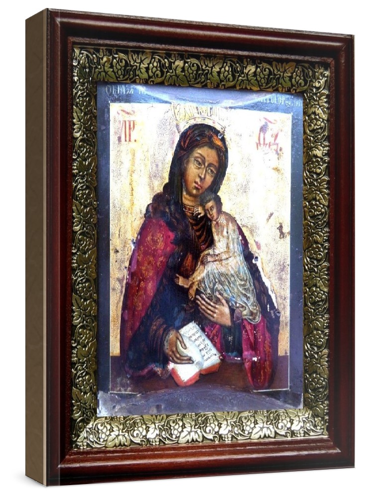 Воргольская икона бм (19х22), темный киот. Лик нанесен методом шелкографии на цельную липовую доску, покрытую левкасом (специальным грунтом под живопись). Использованы минеральные (природные) краски. Размер иконы без киота (см): 13х16, с киотом: 19х22. Киот (рамка) выполнен из березы и украшен басмой (узор из черненой меди в виде виноградной лозы). Икона освящена.