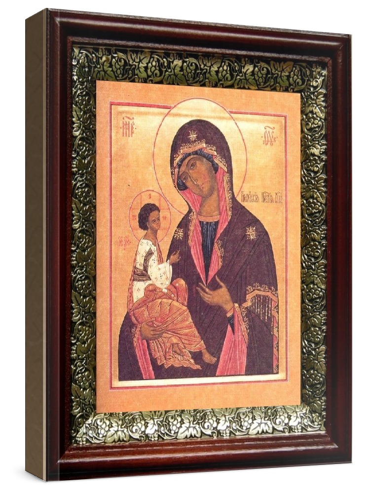 Гребневская икона бм (19х22), темный киот.     Лик нанесен методом шелкографии на цельную липовую доску, покрытую левкасом (специальным грунтом под живопись). Использованы минеральные (природные) краски. Размер иконы без киота (см): 13х16, с киотом: 19х22. Киот (рамка) выполнен из березы и украшен басмой (узор из черненой меди в виде виноградной лозы). Икона освящена.