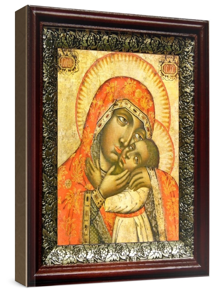 Дегтярёвская икона бм (19х22), темный киот. Лик нанесен методом шелкографии на цельную липовую доску, покрытую левкасом (специальным грунтом под живопись). Использованы минеральные (природные) краски. Размер иконы без киота (см): 13х16, с киотом: 19х22. Киот (рамка) выполнен из березы и украшен басмой (узор из черненой меди в виде виноградной лозы). Икона освящена.