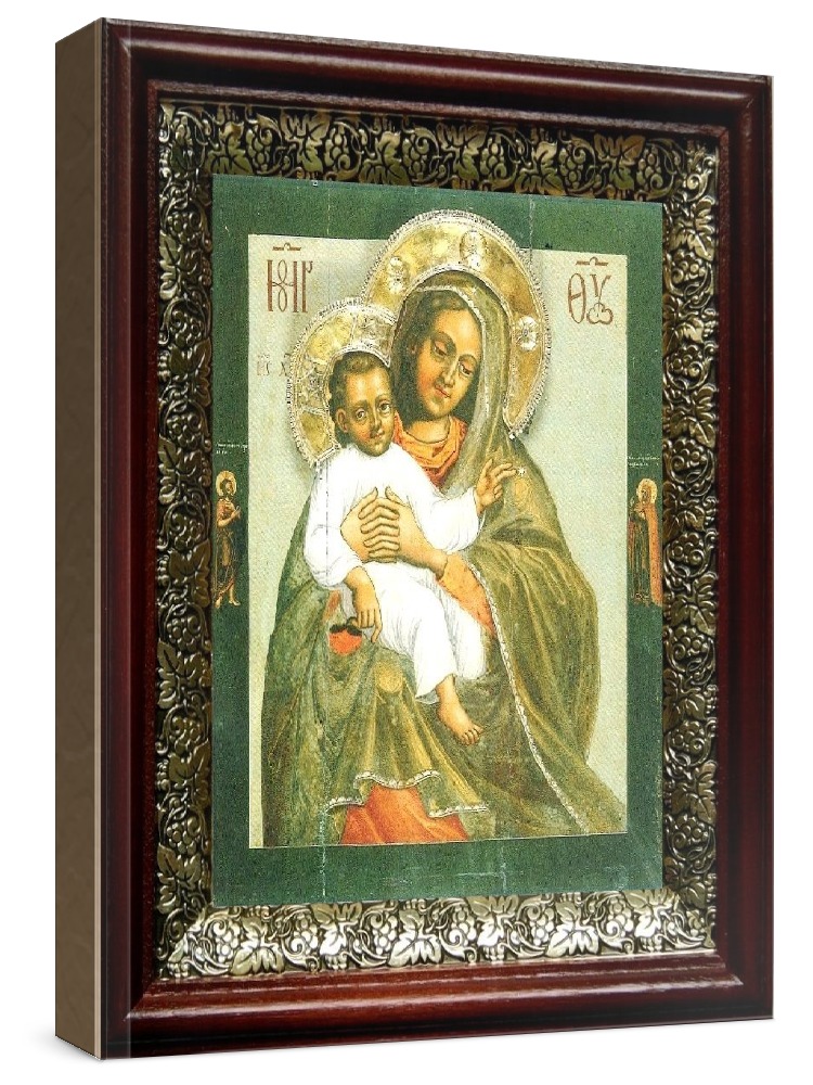 Евтропьевская икона бм (19х22), темный киот. Лик нанесен методом шелкографии на цельную липовую доску, покрытую левкасом (специальным грунтом под живопись). Использованы минеральные (природные) краски. Размер иконы без киота (см): 13х16, с киотом: 19х22. Киот (рамка) выполнен из березы и украшен басмой (узор из черненой меди в виде виноградной лозы). Икона освящена.