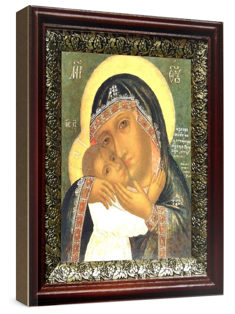 Девпетерувская икона бм (19х22), темный киот. Лик нанесен методом шелкографии на цельную липовую доску, покрытую левкасом (специальным грунтом под живопись). Использованы минеральные (природные) краски. Размер иконы без киота (см): 13х16, с киотом: 19х22. Киот (рамка) выполнен из березы и украшен басмой (узор из черненой меди в виде виноградной лозы). Икона освящена.