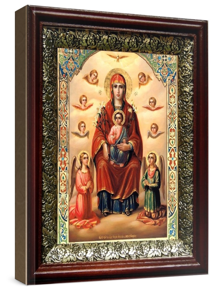 Дивногорская икона бм (19х22), темный киот. Лик нанесен методом шелкографии на цельную липовую доску, покрытую левкасом (специальным грунтом под живопись). Использованы минеральные (природные) краски. Размер иконы без киота (см): 13х16, с киотом: 19х22. Киот (рамка) выполнен из березы и украшен басмой (узор из черненой меди в виде виноградной лозы). Икона освящена.