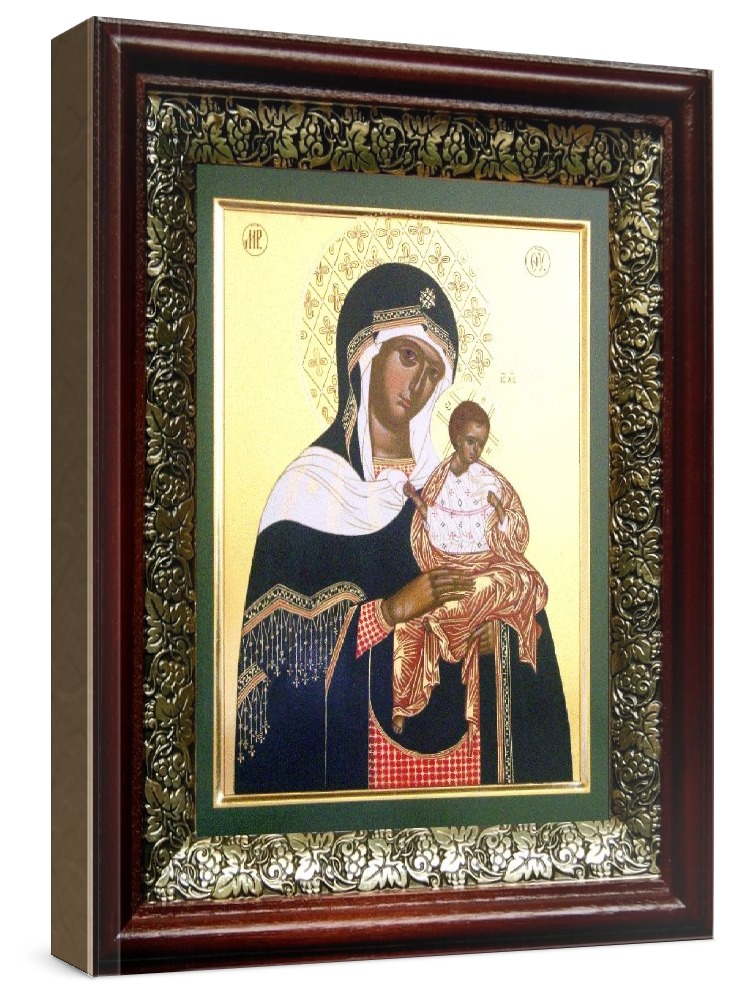 Коневская икона бм (19х22), темный киот. Лик нанесен методом шелкографии на цельную липовую доску, покрытую левкасом (специальным грунтом под живопись). Использованы минеральные (природные) краски. Размер иконы без киота (см): 13х16, с киотом: 19х22. Киот (рамка) выполнен из березы и украшен басмой (узор из черненой меди в виде виноградной лозы). Икона освящена.