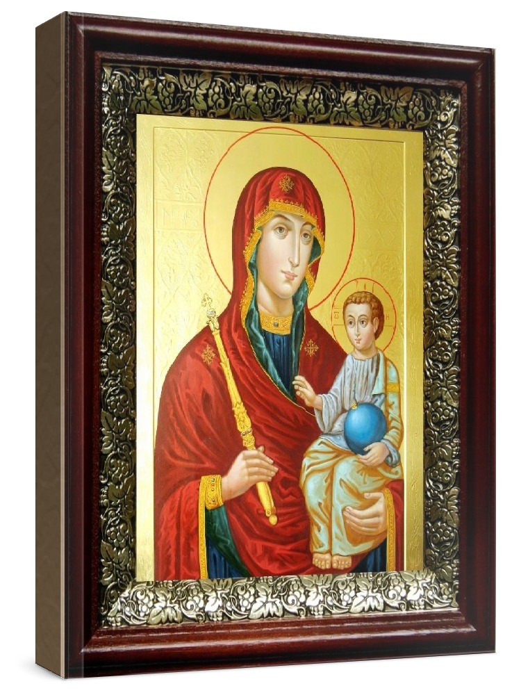 Минская икона бм (19х22), темный киот. Лик нанесен методом шелкографии на цельную липовую доску, покрытую левкасом (специальным грунтом под живопись). Использованы минеральные (природные) краски. Размер иконы без киота (см): 13х16, с киотом: 19х22. Киот со стеклом, выполнен из березы и украшен басмой (узор из черненой меди в виде виноградной лозы). Икона освящена.