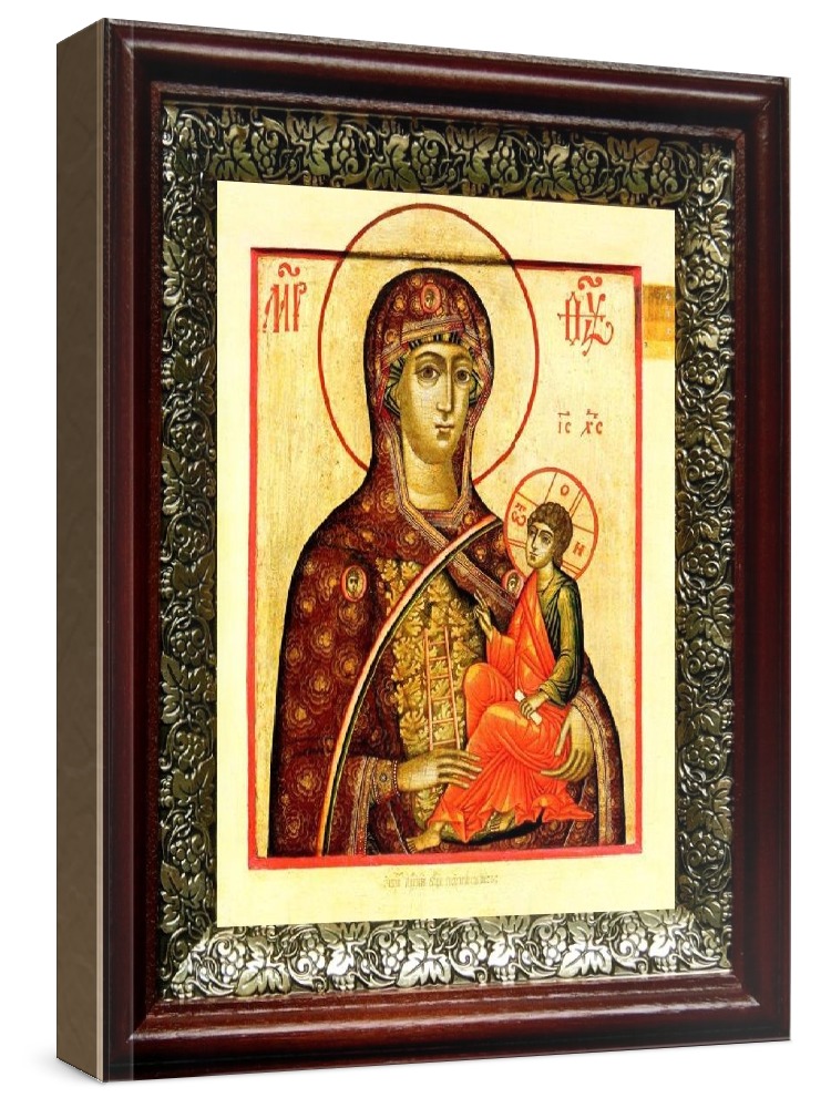 Молченская икона бм (19х22), темный киот. Лик нанесен методом шелкографии на цельную липовую доску, покрытую левкасом (специальным грунтом под живопись). Использованы минеральные (природные) краски. Размер иконы без киота (см): 13х16, с киотом: 19х22. Киот со стеклом, выполнен из березы и украшен басмой (узор из черненой меди в виде виноградной лозы). Икона освящена.