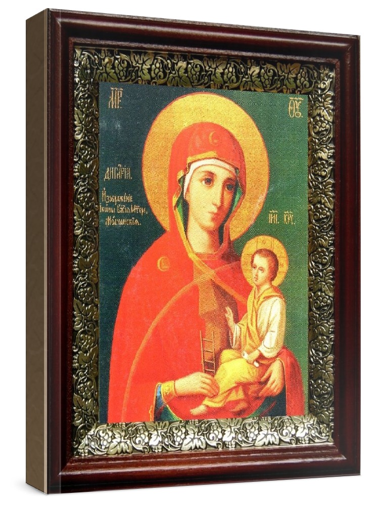 Молченская икона бм (19х22), темный киот. Лик нанесен методом шелкографии на цельную липовую доску, покрытую левкасом (специальным грунтом под живопись). Использованы минеральные (природные) краски. Размер иконы без киота (см): 13х16, с киотом: 19х22. Киот со стеклом, выполнен из березы и украшен басмой (узор из черненой меди в виде виноградной лозы). Икона освящена.