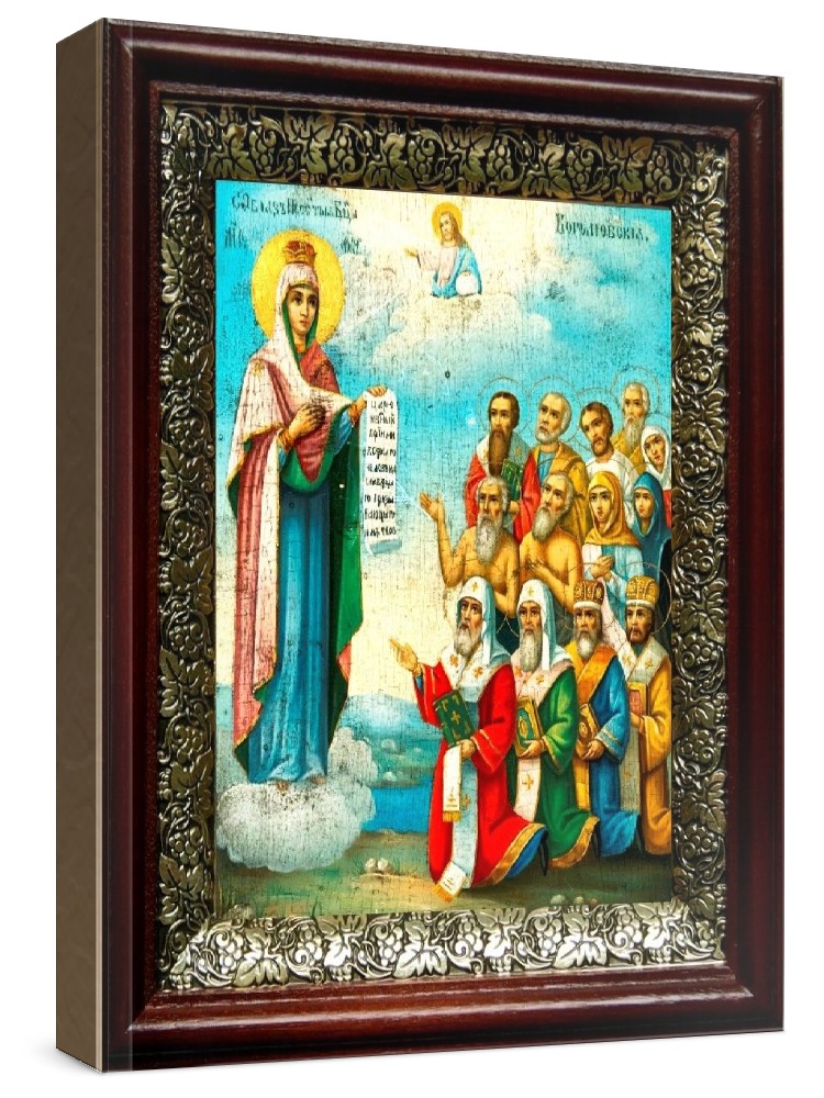Боголюбская (московская) икона бм (19х22), темный киот. Лик нанесен методом шелкографии на цельную липовую доску, покрытую левкасом (специальным грунтом под живопись). Использованы минеральные (природные) краски. Размер иконы без киота (см): 13х16, с киотом: 19х22. Киот со стеклом, выполнен из березы и украшен басмой (узор из черненой меди в виде виноградной лозы). Икона освящена.