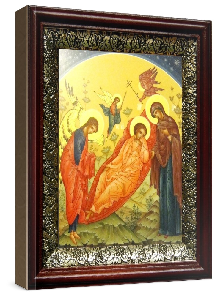Икона недреманное око (19х22), темный киот. Лик нанесен методом шелкографии на цельную липовую доску, покрытую левкасом (специальным грунтом под живопись). Использованы минеральные (природные) краски. Размер иконы без киота (см): 13х16, с киотом: 19х22. Киот со стеклом, выполнен из березы и украшен басмой (узор из черненой меди в виде виноградной лозы). Икона освящена.