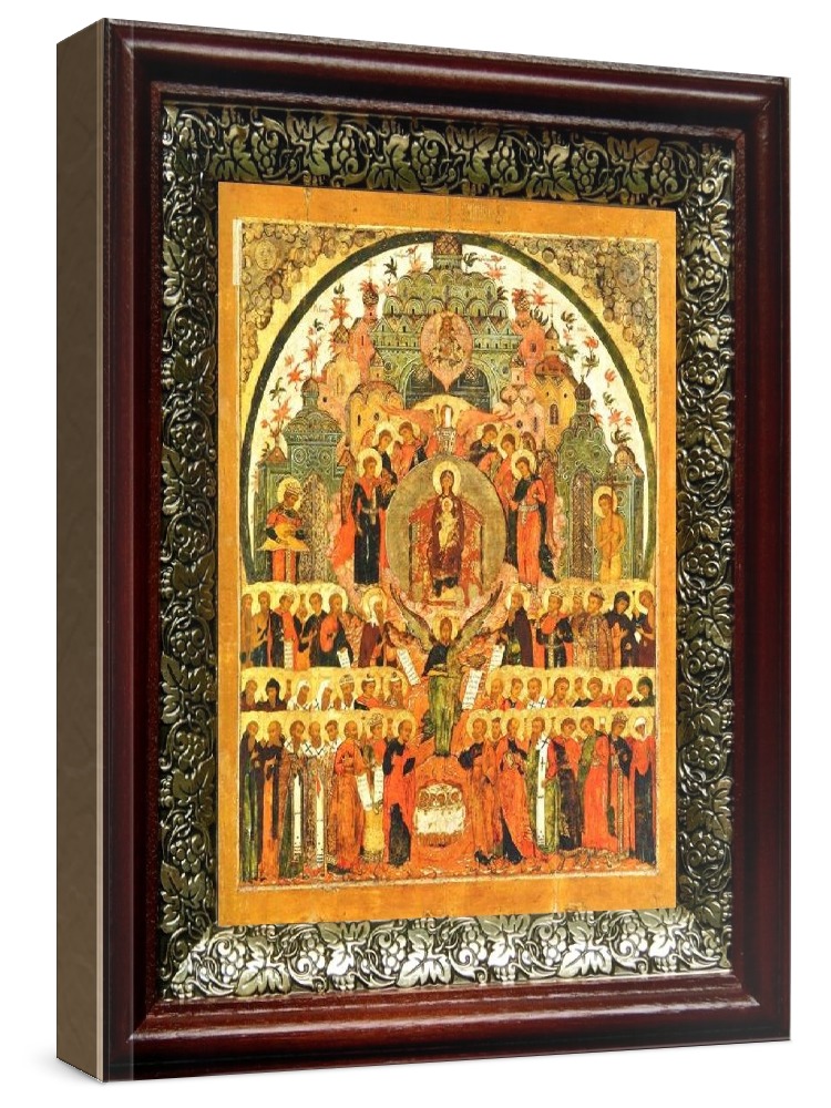 Икона о тебе радуется (19х22), темный киот. Лик нанесен методом шелкографии на цельную липовую доску, покрытую левкасом (специальным грунтом под живопись). Использованы минеральные (природные) краски. Размер иконы без киота (см): 13х16, с киотом: 19х22. Киот со стеклом, выполнен из березы и украшен басмой (узор из черненой меди в виде виноградной лозы). Икона освящена.