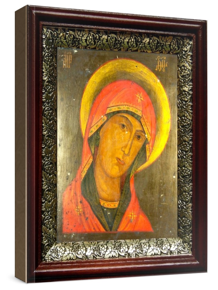 Огневидная икона бм (19х22), темный киот. Лик нанесен методом шелкографии на цельную липовую доску, покрытую левкасом (специальным грунтом под живопись). Использованы минеральные (природные) краски. Размер иконы без киота (см): 13х16, с киотом: 19х22. Киот со стеклом, выполнен из березы и украшен басмой (узор из черненой меди в виде виноградной лозы). Икона освящена.