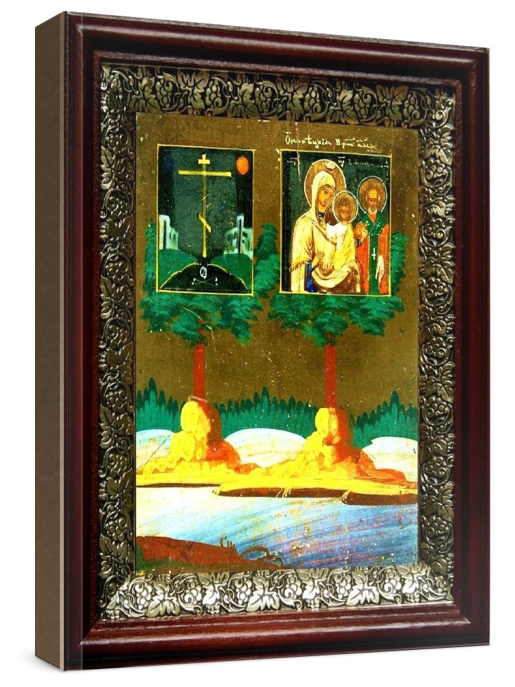 Оковецкая икона бм (19х22), темный киот. Лик нанесен методом шелкографии на цельную липовую доску, покрытую левкасом (специальным грунтом под живопись). Использованы минеральные (природные) краски. Размер иконы без киота (см): 13х16, с киотом: 19х22. Киот со стеклом, выполнен из березы и украшен басмой (узор из черненой меди в виде виноградной лозы). Икона освящена.