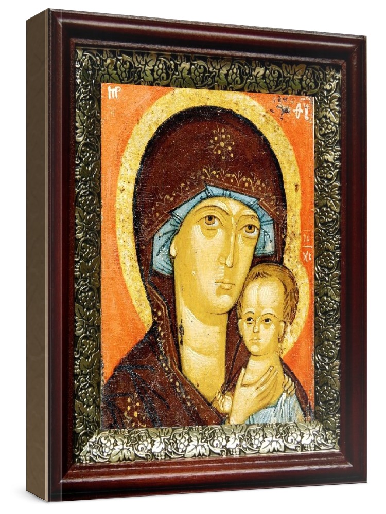Петровская икона бм (19х22), темный киот. Лик нанесен методом шелкографии на цельную липовую доску, покрытую левкасом (специальным грунтом под живопись). Использованы минеральные (природные) краски. Размер иконы без киота (см): 13х16, с киотом: 19х22. Киот со стеклом, выполнен из березы и украшен басмой (узор из черненой меди в виде виноградной лозы). Икона освящена.