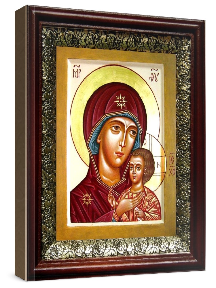 Петровская икона бм (19х22), темный киот. Лик нанесен методом шелкографии на цельную липовую доску, покрытую левкасом (специальным грунтом под живопись). Использованы минеральные (природные) краски. Размер иконы без киота (см): 13х16, с киотом: 19х22. Киот со стеклом, выполнен из березы и украшен басмой (узор из черненой меди в виде виноградной лозы). Икона освящена.