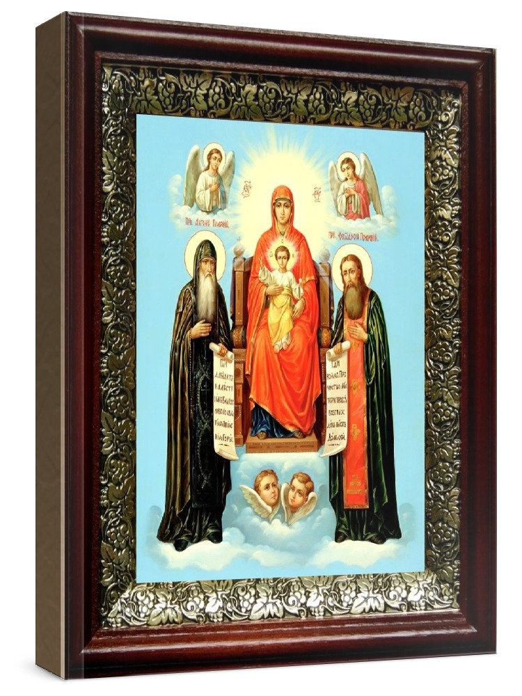 Печерская икона бм (19х22), темный киот. Лик нанесен методом шелкографии на цельную липовую доску, покрытую левкасом (специальным грунтом под живопись). Использованы минеральные (природные) краски. Размер иконы без киота (см): 13х16, с киотом: 19х22. Киот со стеклом, выполнен из березы и украшен басмой (узор из черненой меди в виде виноградной лозы). Икона освящена.