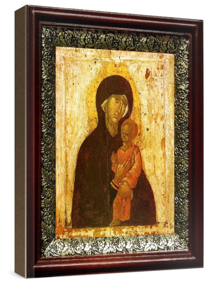 Пименовская икона бм (19х22), темный киот.     Лик нанесен методом шелкографии на цельную липовую доску, покрытую левкасом (специальным грунтом под живопись). Использованы минеральные (природные) краски.  Размер иконы без киота (см): 13х16, с киотом: 19х22.  Киот со стеклом, выполнен из березы и украшен басмой (узор из черненой меди в виде виноградной лозы).  Икона освящена.