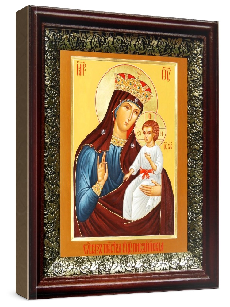 Писидийская икона бм (19х22), темный киот. Лик нанесен методом шелкографии на цельную липовую доску, покрытую левкасом (специальным грунтом под живопись). Использованы минеральные (природные) краски. Размер иконы без киота (см): 13х16, с киотом: 19х22. Киот со стеклом, выполнен из березы и украшен басмой (узор из черненой меди в виде виноградной лозы). Икона освящена.