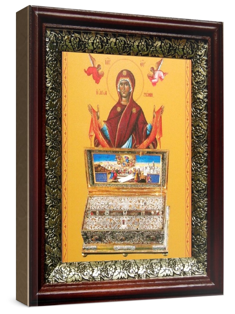 Икона пояс пресвятой богородицы (19х22), темный киот. Лик нанесен методом шелкографии на цельную липовую доску, покрытую левкасом (специальным грунтом под живопись). Использованы минеральные (природные) краски. Размер иконы без киота (см): 13х16, с киотом: 19х22. Киот со стеклом, выполнен из березы и украшен басмой (узор из черненой меди в виде виноградной лозы). Икона освящена.