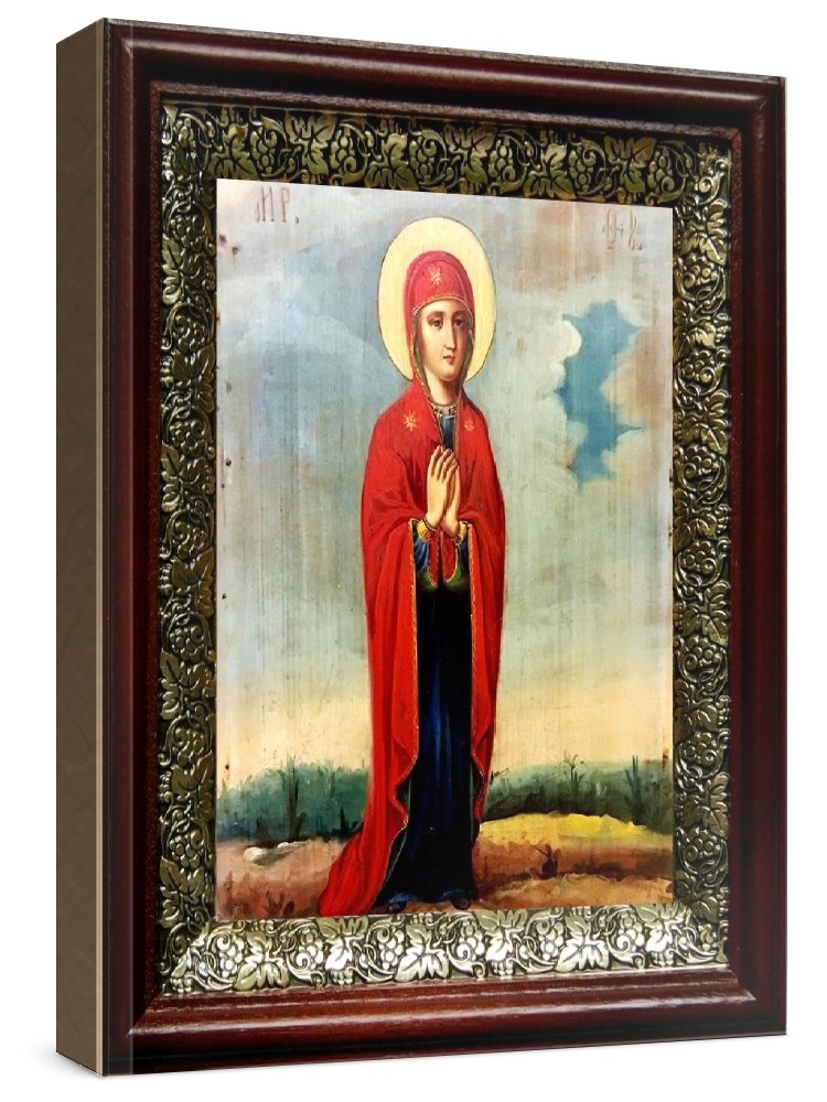 Скорбящая икона бм (19х22), темный киот. Лик нанесен методом шелкографии на цельную липовую доску, покрытую левкасом (специальным грунтом под живопись). Использованы минеральные (природные) краски. Размер иконы без киота (см): 13х16, с киотом: 19х22. Киот со стеклом, выполнен из березы и украшен басмой (узор из черненой меди в виде виноградной лозы). Икона освящена.