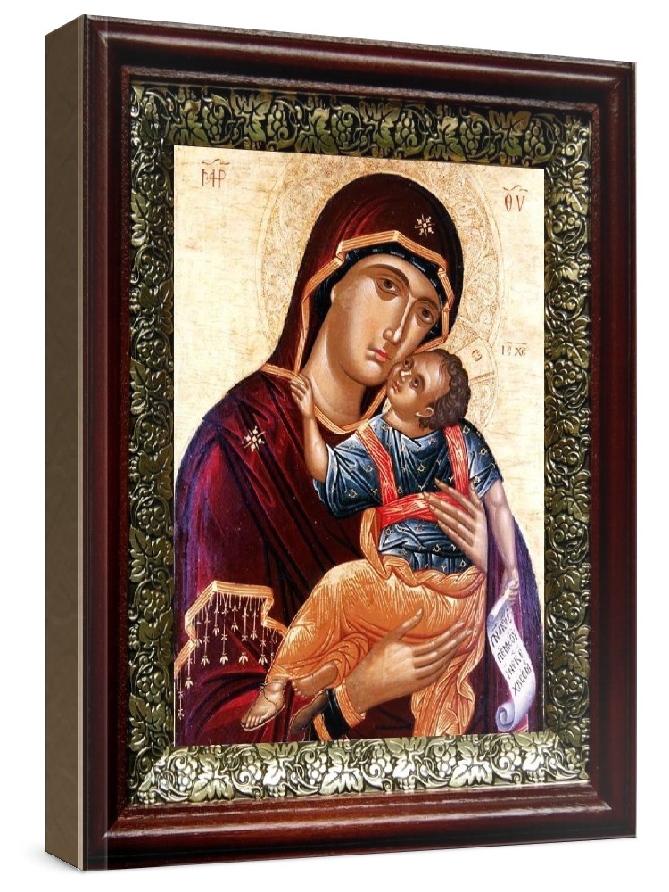 Икона сладкое лобзание (19х22), темный киот. Лик нанесен методом шелкографии на цельную липовую доску, покрытую левкасом (специальным грунтом под живопись). Использованы минеральные (природные) краски. Размер иконы без киота (см): 13х16, с киотом: 19х22. Киот со стеклом, выполнен из березы и украшен басмой (узор из черненой меди в виде виноградной лозы). Икона освящена.