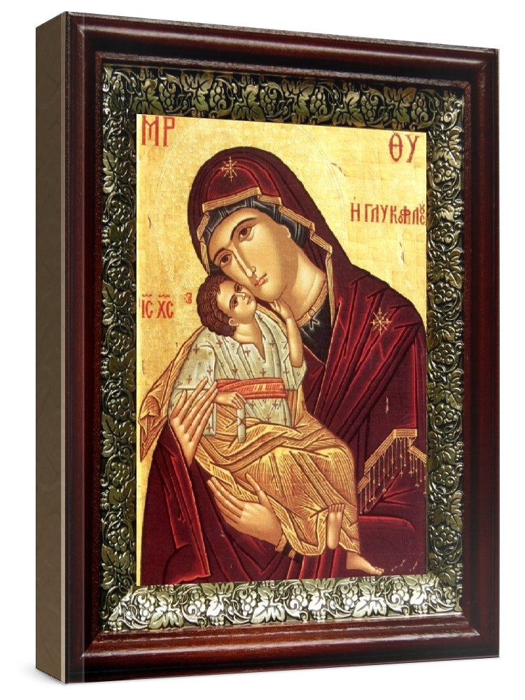 Икона сладкое лобзание (19х22), темный киот. Лик нанесен методом шелкографии на цельную липовую доску, покрытую левкасом (специальным грунтом под живопись). Использованы минеральные (природные) краски. Размер иконы без киота (см): 13х16, с киотом: 19х22. Киот со стеклом, выполнен из березы и украшен басмой (узор из черненой меди в виде виноградной лозы). Икона освящена.