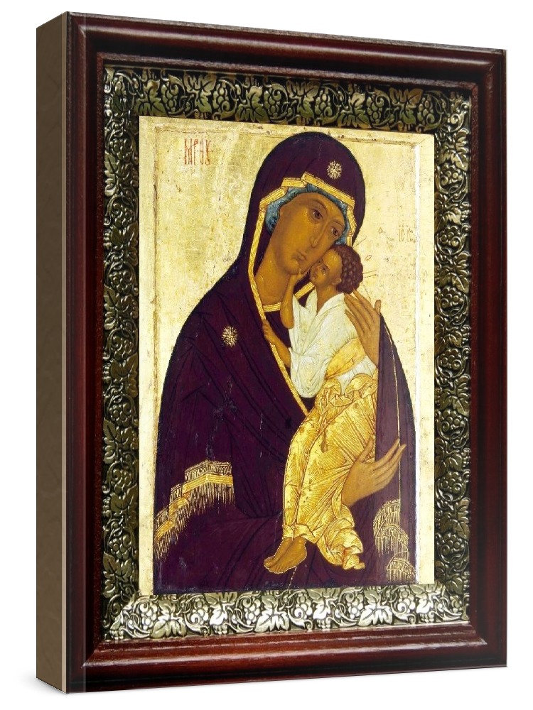 Смоленская ярославская икона бм (19х22), темный киот. Лик нанесен методом шелкографии на цельную липовую доску, покрытую левкасом (специальным грунтом под живопись). Использованы минеральные (природные) краски. Размер иконы без киота (см): 13х16, с киотом: 19х22. Киот со стеклом, выполнен из березы и украшен басмой (узор из черненой меди в виде виноградной лозы). Икона освящена.
