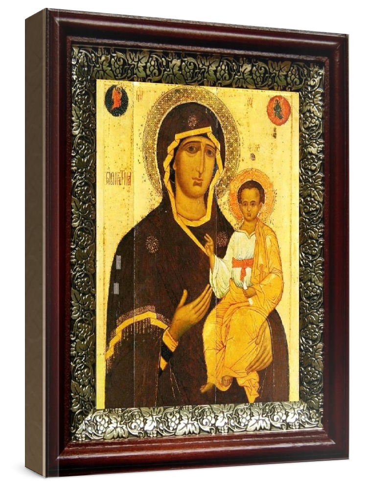 Смоленская ярославская икона бм (19х22), темный киот. Лик нанесен методом шелкографии на цельную липовую доску, покрытую левкасом (специальным грунтом под живопись). Использованы минеральные (природные) краски. Размер иконы без киота (см): 13х16, с киотом: 19х22. Киот со стеклом, выполнен из березы и украшен басмой (узор из черненой меди в виде виноградной лозы). Икона освящена.