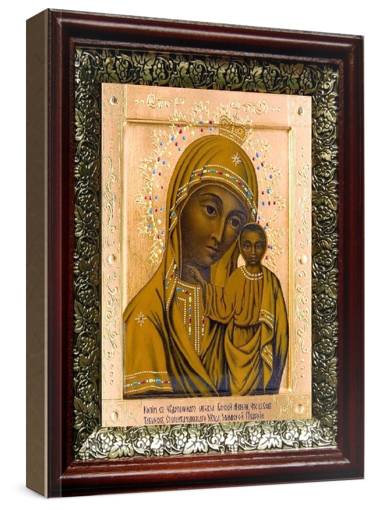 Табынская икона бм (19х22), темный киот. Лик нанесен методом шелкографии на цельную липовую доску, покрытую левкасом (специальным грунтом под живопись). Использованы минеральные (природные) краски. Размер иконы без киота (см): 13х16, с киотом: 19х22. Киот со стеклом, выполнен из березы и украшен басмой (узор из черненой меди в виде виноградной лозы). Икона освящена.