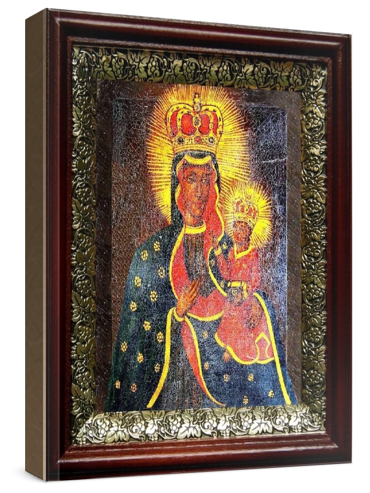 Тывровская икона бм (19х22), темный киот. Лик нанесен методом шелкографии на цельную липовую доску, покрытую левкасом (специальным грунтом под живопись). Использованы минеральные (природные) краски. Размер иконы без киота (см): 13х16, с киотом: 19х22. Киот со стеклом, выполнен из березы и украшен басмой (узор из черненой меди в виде виноградной лозы). Икона освящена.