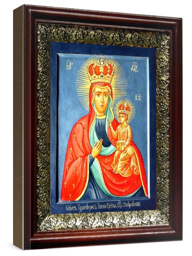 Тывровская икона бм (19х22), темный киот. Лик нанесен методом шелкографии на цельную липовую доску, покрытую левкасом (специальным грунтом под живопись). Использованы минеральные (природные) краски. Размер иконы без киота (см): 13х16, с киотом: 19х22. Киот со стеклом, выполнен из березы и украшен басмой (узор из черненой меди в виде виноградной лозы). Икона освящена.