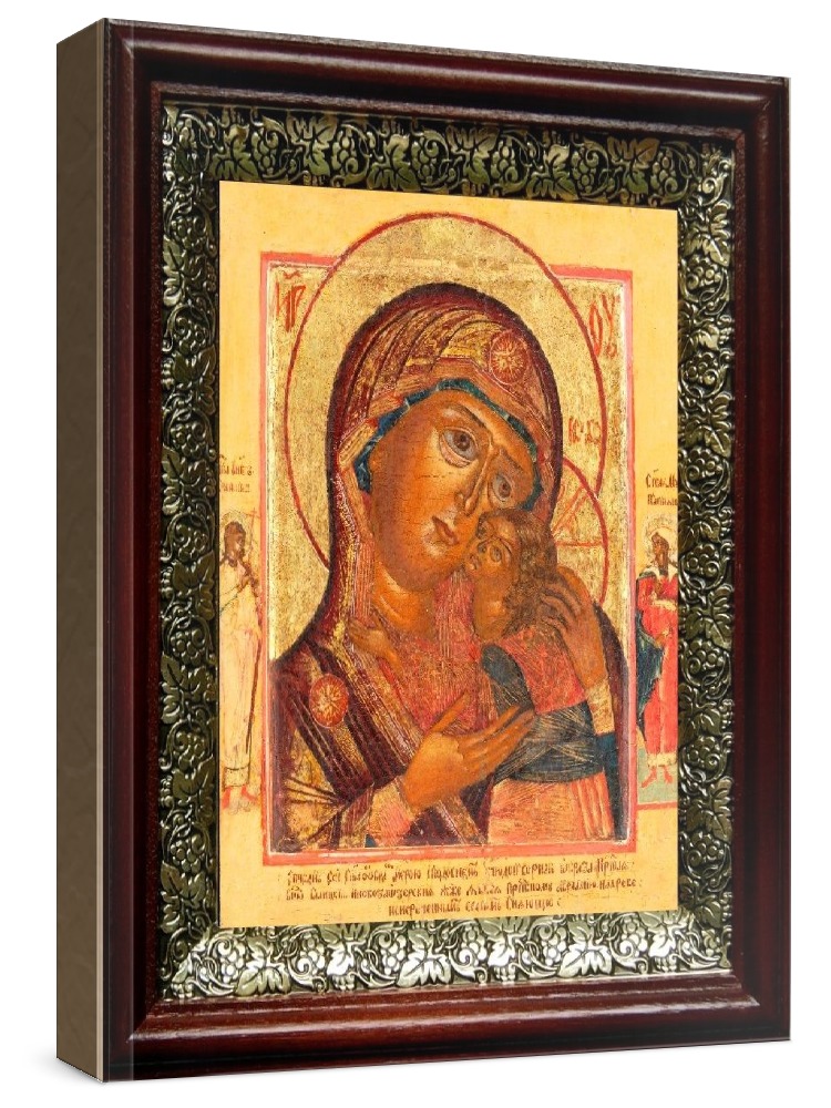 Чухломская (галичская) икона бм (19х22), темный киот. Лик нанесен методом шелкографии на цельную липовую доску, покрытую левкасом (специальным грунтом под живопись). Использованы минеральные (природные) краски. Размер иконы без киота (см): 13х16, с киотом: 19х22. Киот со стеклом, выполнен из березы и украшен басмой (узор из черненой меди в виде виноградной лозы). Икона освящена.
