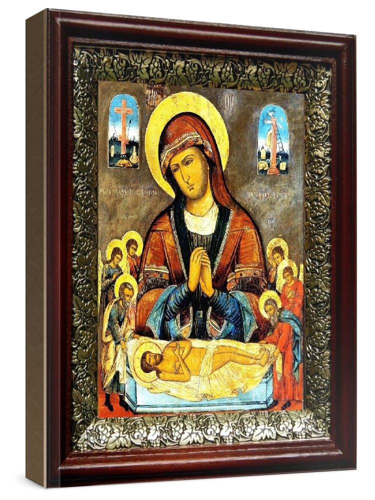 Икона положение во гроб (19х22), темный киот. Лик нанесен методом шелкографии на цельную липовую доску, покрытую левкасом (специальным грунтом под живопись). Использованы минеральные (природные) краски. Размер иконы без киота (см): 13х16, с киотом: 19х22. Киот со стеклом, выполнен из березы и украшен басмой (узор из черненой меди в виде виноградной лозы). Икона освящена.