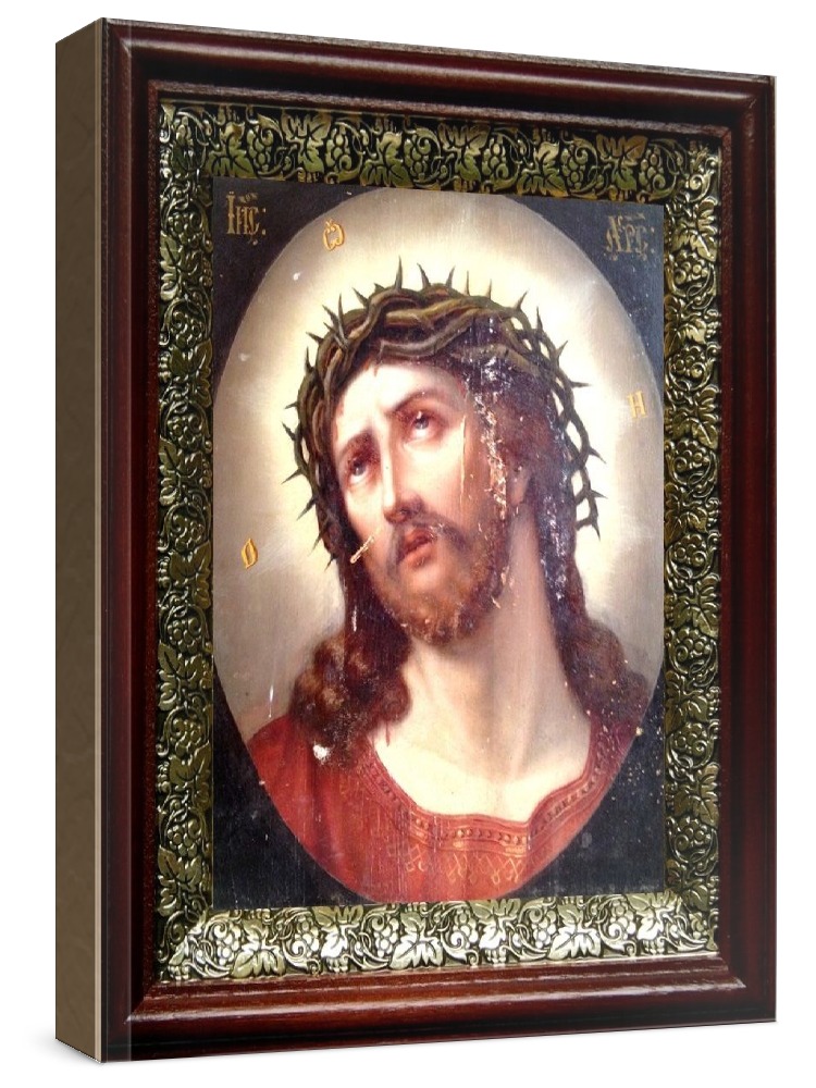 Икона спас в терновом венце (19х22), темный киот. Лик нанесен методом шелкографии на цельную липовую доску, покрытую левкасом (специальным грунтом под живопись). Использованы минеральные (природные) краски. Размер иконы без киота (см): 13х16, с киотом: 19х22. Киот со стеклом, выполнен из березы и украшен басмой (узор из черненой меди в виде виноградной лозы). Икона освящена.