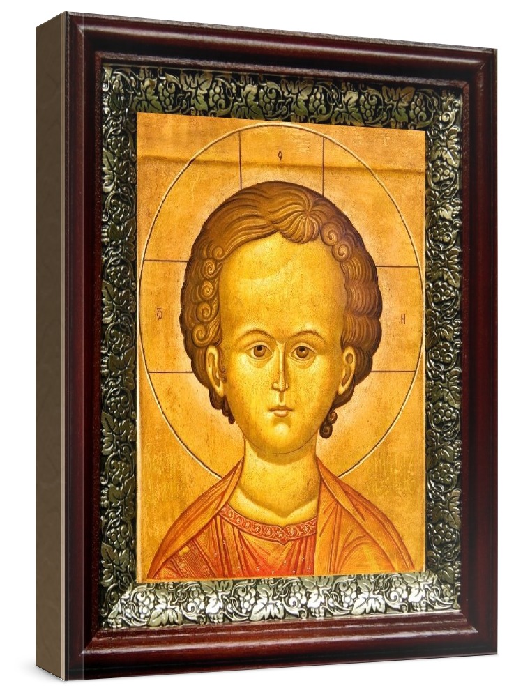 Икона спас эммануил (19х22), темный киот. Лик нанесен методом шелкографии на цельную липовую доску, покрытую левкасом (специальным грунтом под живопись). Использованы минеральные (природные) краски. Размер иконы без киота (см): 13х16, с киотом: 19х22. Киот со стеклом, выполнен из березы и украшен басмой (узор из черненой меди в виде виноградной лозы). Икона освящена.