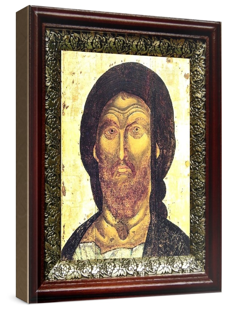 Икона спас ярое око (19х22), темный киот. Лик нанесен методом шелкографии на цельную липовую доску, покрытую левкасом (специальным грунтом под живопись). Использованы минеральные (природные) краски. Размер иконы без киота (см): 13х16, с киотом: 19х22. Киот со стеклом, выполнен из березы и украшен басмой (узор из черненой меди в виде виноградной лозы). Икона освящена.