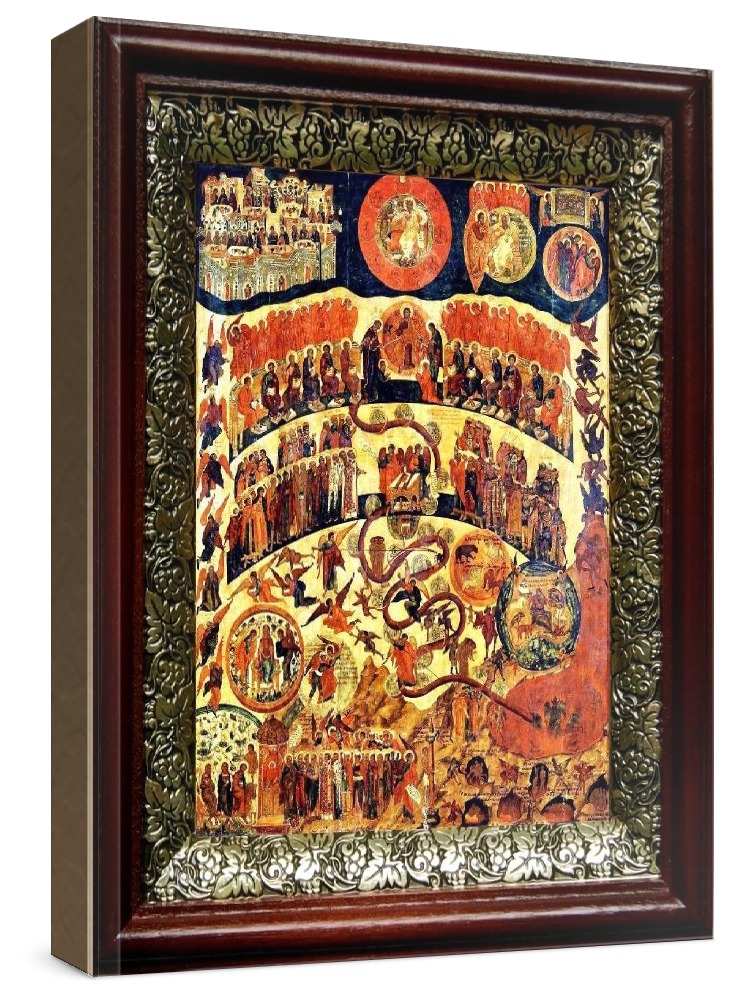 Икона страшный суд (19х22), темный киот. Лик нанесен методом шелкографии на цельную липовую доску, покрытую левкасом (специальным грунтом под живопись). Использованы минеральные (природные) краски. Размер иконы без киота (см): 13х16, с киотом: 19х22. Киот со стеклом, выполнен из березы и украшен басмой (узор из черненой меди в виде виноградной лозы). Икона освящена.