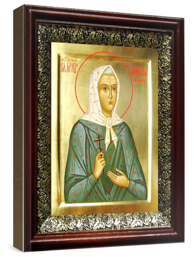 Икона анисия масланова (19х22), темный киот. Лик нанесен методом шелкографии на цельную липовую доску, покрытую левкасом (специальным грунтом под живопись). Использованы минеральные (природные) краски. Размер иконы без киота (см): 13х16, с киотом: 19х22. Киот со стеклом, выполнен из березы и украшен басмой (узор из черненой меди в виде виноградной лозы). Икона освящена.