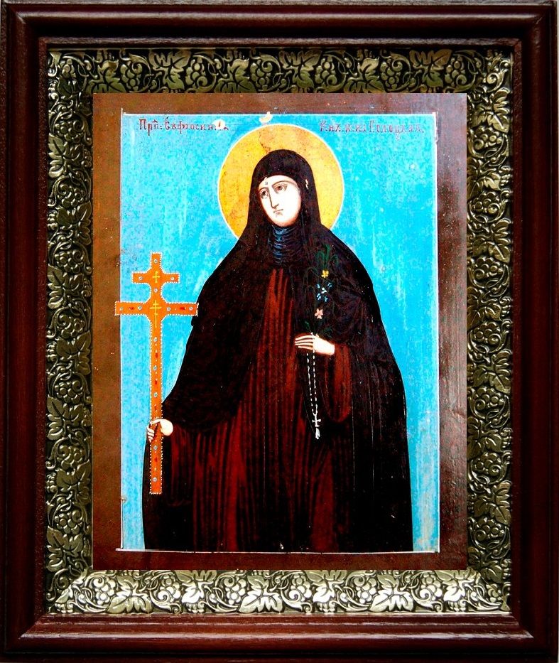 Икона евфросиния полоцкая (19х22), темный киот. Лик нанесен методом шелкографии на цельную липовую доску, покрытую левкасом (специальным грунтом под живопись). Использованы минеральные (природные) краски. Размер иконы без киота (см): 13х16, с киотом: 19х22. Киот со стеклом, выполнен из березы и украшен басмой (узор из черненой меди в виде виноградной лозы). Икона освящена.