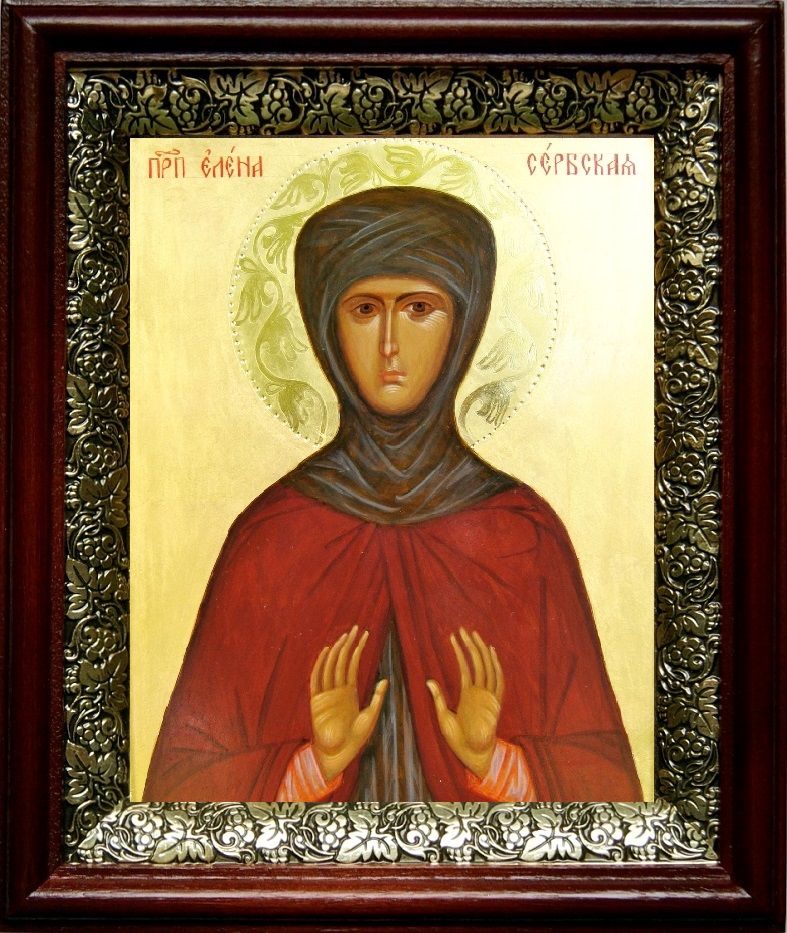 Икона елена сербская (19х22), темный киот. Лик нанесен методом шелкографии на цельную липовую доску, покрытую левкасом (специальным грунтом под живопись). Использованы минеральные (природные) краски. Размер иконы без киота (см): 13х16, с киотом: 19х22. Киот со стеклом, выполнен из березы и украшен басмой (узор из черненой меди в виде виноградной лозы). Икона освящена.