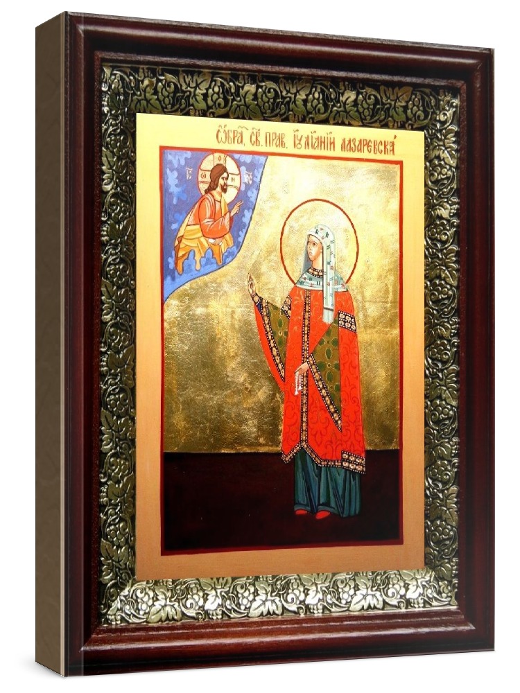 Икона иулиания лазаревская (19х22), темный киот. Лик нанесен методом шелкографии на цельную липовую доску, покрытую левкасом (специальным грунтом под живопись). Использованы минеральные (природные) краски. Размер иконы без киота (см): 13х16, с киотом: 19х22. Киот со стеклом, выполнен из березы и украшен басмой (узор из черненой меди в виде виноградной лозы). Икона освящена.