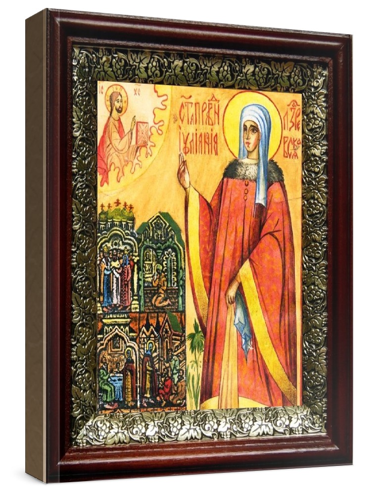 Икона иулиания лазаревская (19х22), темный киот. Лик нанесен методом шелкографии на цельную липовую доску, покрытую левкасом (специальным грунтом под живопись). Использованы минеральные (природные) краски. Размер иконы без киота (см): 13х16, с киотом: 19х22. Киот со стеклом, выполнен из березы и украшен басмой (узор из черненой меди в виде виноградной лозы). Икона освящена.