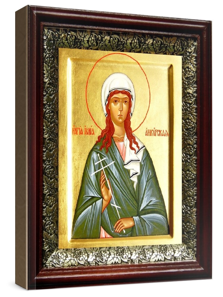 Икона иулия анкирская (19х22), темный киот. Лик нанесен методом шелкографии на цельную липовую доску, покрытую левкасом (специальным грунтом под живопись). Использованы минеральные (природные) краски. Размер иконы без киота (см): 13х16, с киотом: 19х22. Киот со стеклом, выполнен из березы и украшен басмой (узор из черненой меди в виде виноградной лозы). Икона освящена.