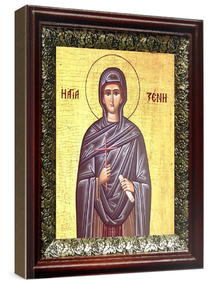 Икона ксения миласская (19х22), темный киот. Лик нанесен методом шелкографии на цельную липовую доску, покрытую левкасом (специальным грунтом под живопись). Использованы минеральные (природные) краски. Размер иконы без киота (см): 13х16, с киотом: 19х22. Киот со стеклом, выполнен из березы и украшен басмой (узор из черненой меди в виде виноградной лозы). Икона освящена.