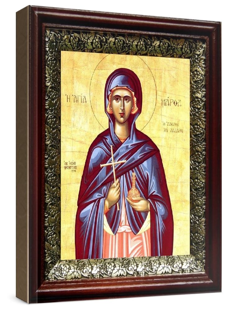 Икона марфа вифанская (19х22), темный киот. Лик нанесен методом шелкографии на цельную липовую доску, покрытую левкасом (специальным грунтом под живопись). Использованы минеральные (природные) краски. Размер иконы без киота (см): 13х16, с киотом: 19х22. Киот со стеклом, выполнен из березы и украшен басмой (узор из черненой меди в виде виноградной лозы). Икона освящена.