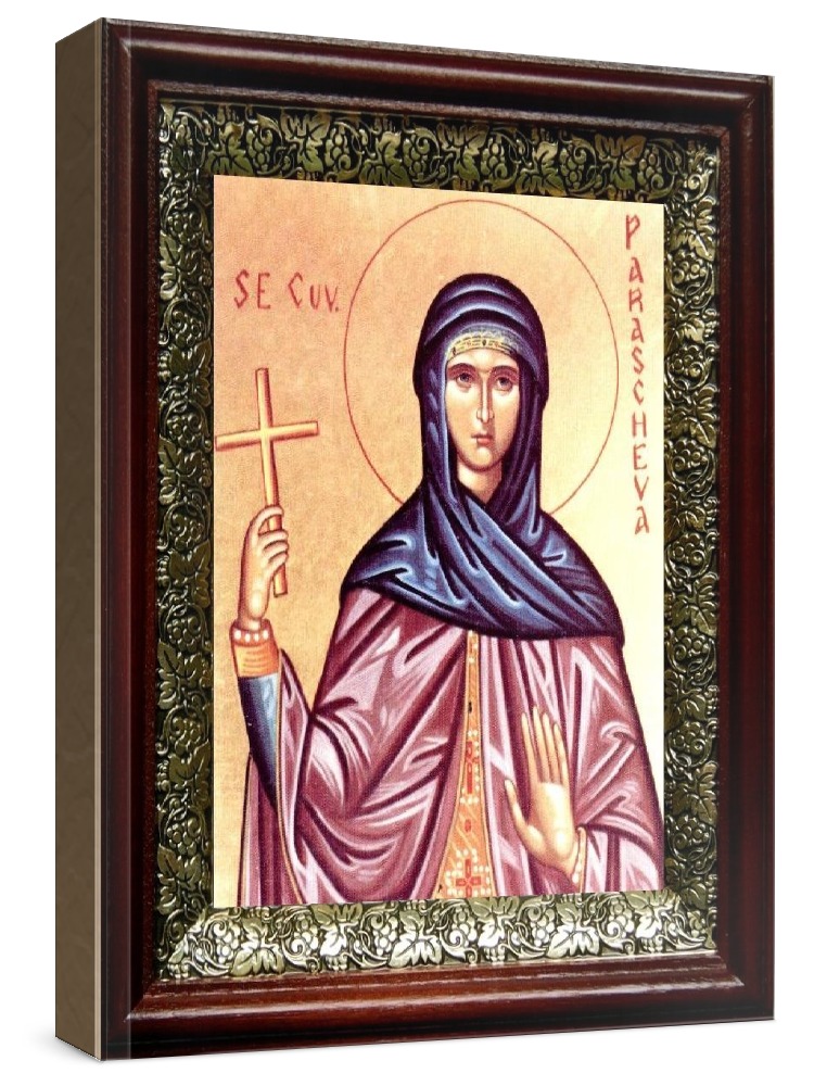 Икона параскева петка сербская (19х22), темный киот. Лик нанесен методом шелкографии на цельную липовую доску, покрытую левкасом (специальным грунтом под живопись). Использованы минеральные (природные) краски. Размер иконы без киота (см): 13х16, с киотом: 19х22. Киот со стеклом, выполнен из березы и украшен басмой (узор из черненой меди в виде виноградной лозы). Икона освящена.