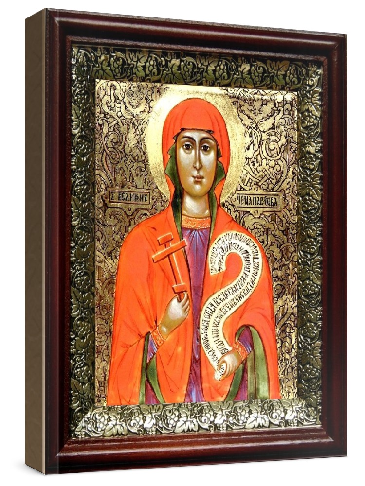 Икона параскева пятница (19х22), темный киот. Лик нанесен методом шелкографии на цельную липовую доску, покрытую левкасом (специальным грунтом под живопись). Использованы минеральные (природные) краски. Размер иконы без киота (см): 13х16, с киотом: 19х22. Киот со стеклом, выполнен из березы и украшен басмой (узор из черненой меди в виде виноградной лозы). Икона освящена.
