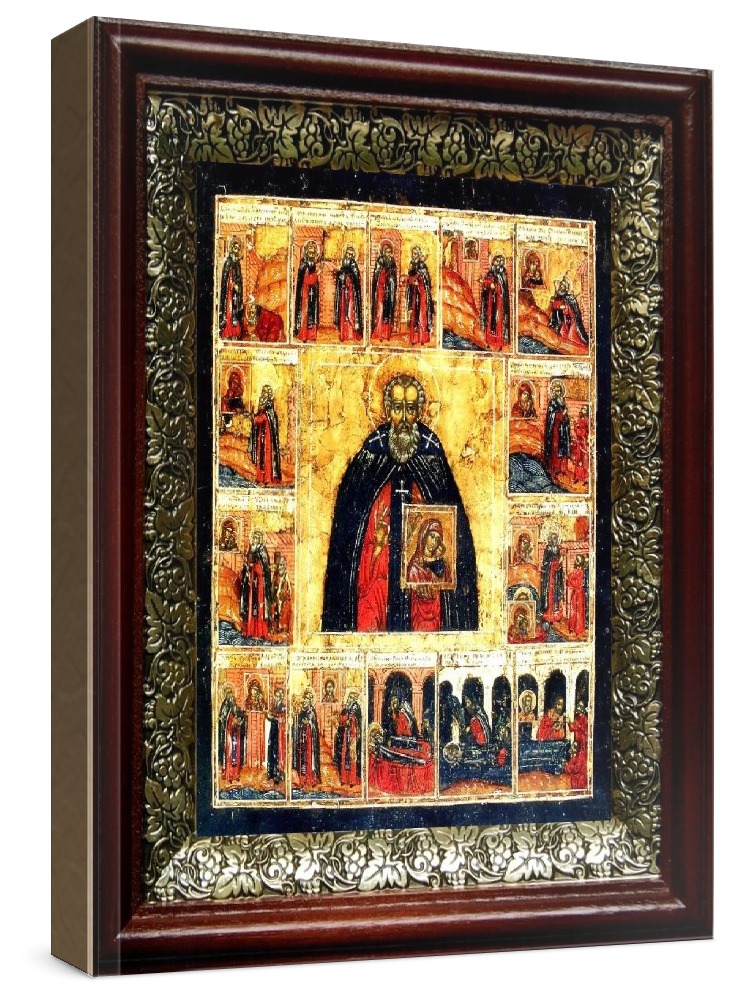 Икона авраамий галичский (19х22), темный киот. Лик нанесен методом шелкографии на цельную липовую доску, покрытую левкасом (специальным грунтом под живопись). Использованы минеральные (природные) краски. Размер иконы без киота (см): 13х16, с киотом: 19х22. Киот со стеклом, выполнен из березы и украшен басмой (узор из черненой меди в виде виноградной лозы). Икона освящена.