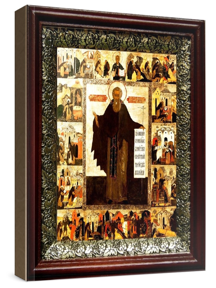 Икона авраамий ростовский (19х22), темный киот. Лик нанесен методом шелкографии на цельную липовую доску, покрытую левкасом (специальным грунтом под живопись). Использованы минеральные (природные) краски. Размер иконы без киота (см): 13х16, с киотом: 19х22. Киот со стеклом, выполнен из березы и украшен басмой (узор из черненой меди в виде виноградной лозы). Икона освящена.