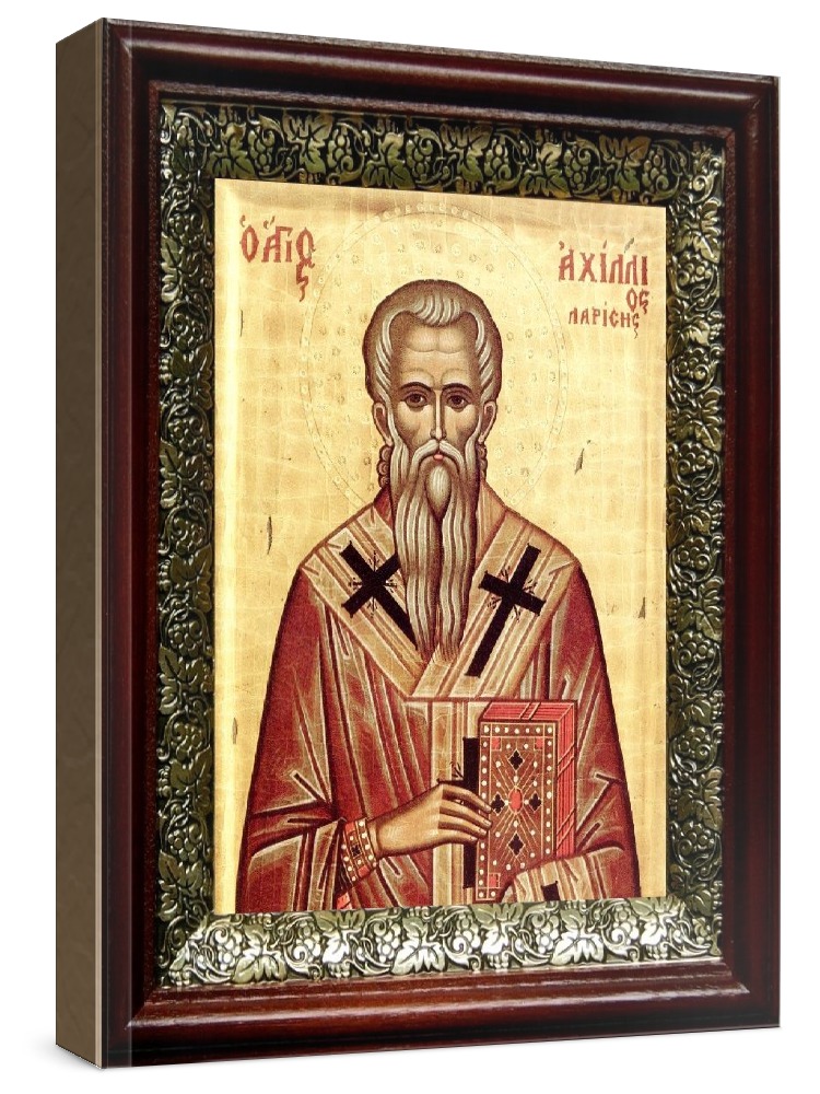 Икона акакий (19х22), темный киот. Лик нанесен методом шелкографии на цельную липовую доску, покрытую левкасом (специальным грунтом под живопись). Использованы минеральные (природные) краски. Размер иконы без киота (см): 13х16, с киотом: 19х22. Киот со стеклом, выполнен из березы и украшен басмой (узор из черненой меди в виде виноградной лозы). Икона освящена.
