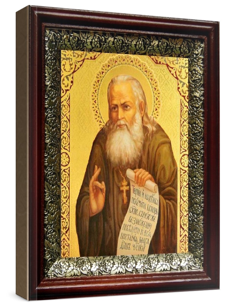 Икона алексий бортсурманский (19х22), темный киот. Лик нанесен методом шелкографии на цельную липовую доску, покрытую левкасом (специальным грунтом под живопись). Использованы минеральные (природные) краски. Размер иконы без киота (см): 13х16, с киотом: 19х22. Киот со стеклом, выполнен из березы и украшен басмой (узор из черненой меди в виде виноградной лозы). Икона освящена.